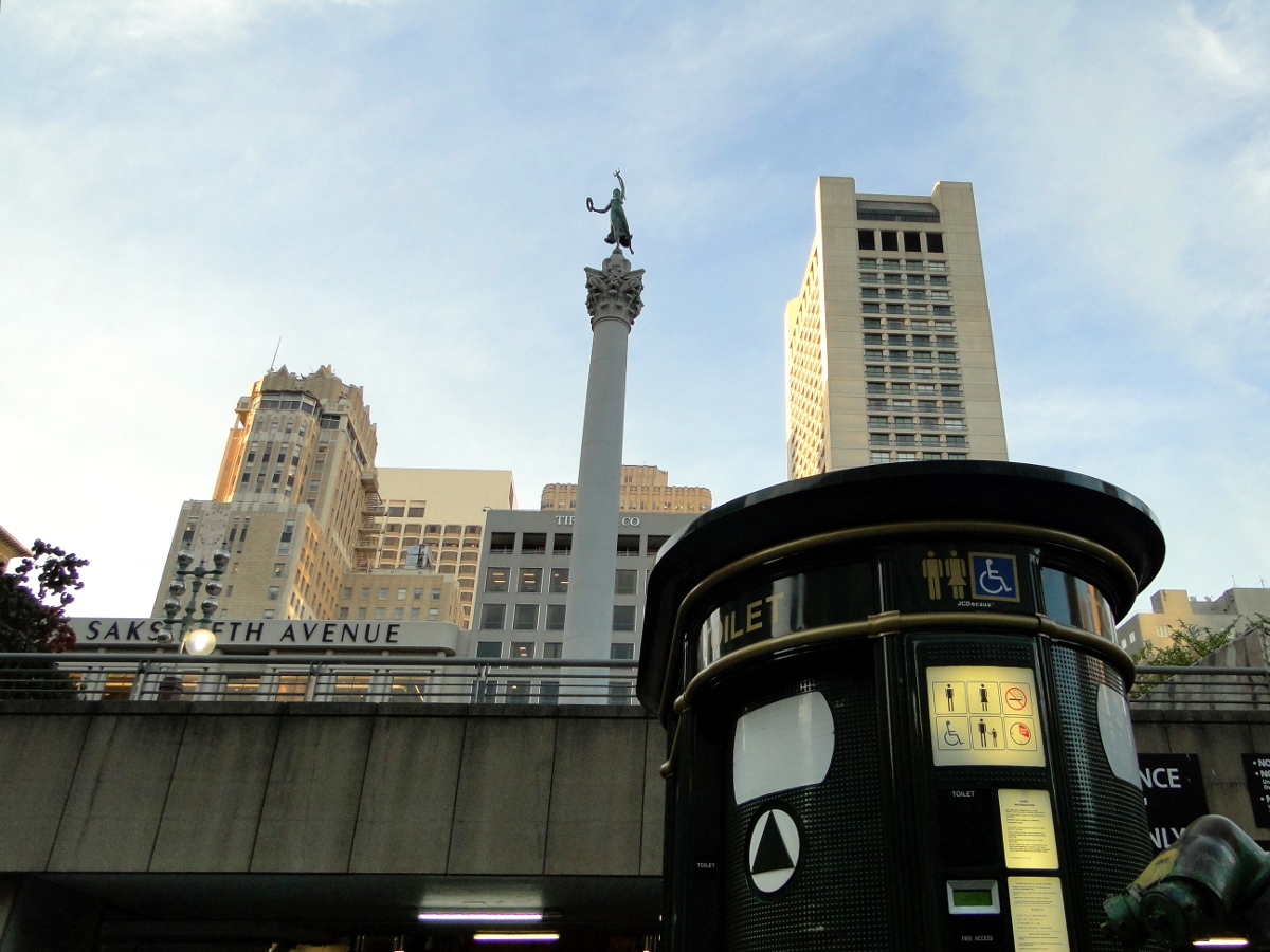The image showcases a vibrant city scene, featuring a bustling street corner with a mix of historic and modern architecture. Dominating the view is a towering skyscraper, adorned with various signs and advertisements that hint at the urban character of San Francisco. The statue in the foreground adds an artistic touch to the cityscape, while the overcast sky casts a soft light over the scene.