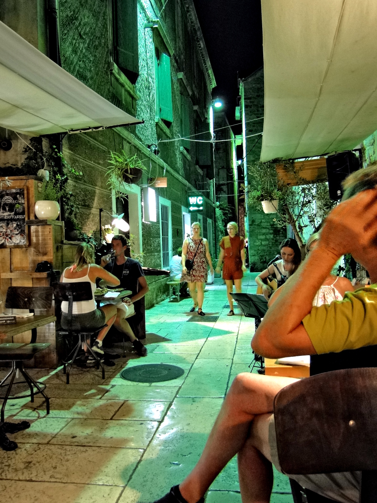 This image captures a lively night in the old town of Split, Croatia. The cobblestone street is lined with outdoor cafes and bars, creating an inviting atmosphere for locals and tourists alike. People can be seen strolling along the sidewalks, enjoying the cool evening air. Streetlights cast a warm glow on the buildings lining the street, adding to the charm of the scene.