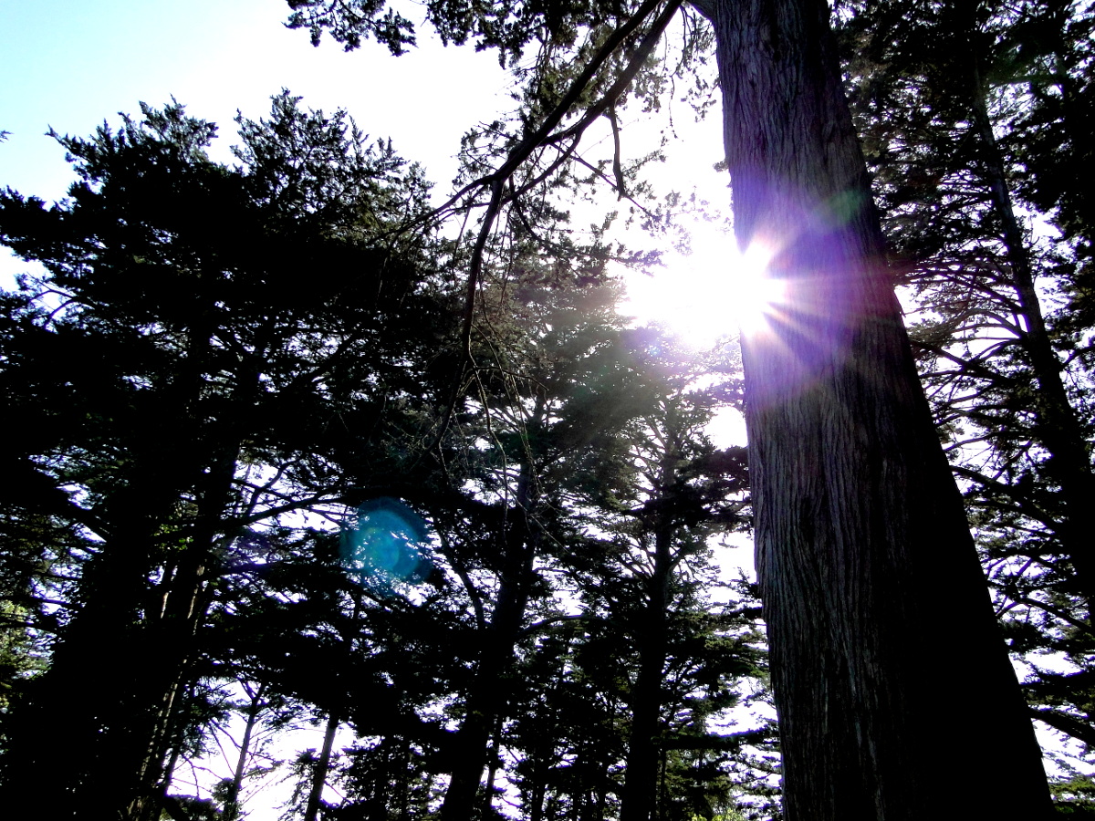 This image captures the tranquility of San Francisco's redwood forests. The sunbeam pierces through the lush canopy, casting long shadows and creating a peaceful atmosphere. It's a snapshot of a typical day in this picturesque area.