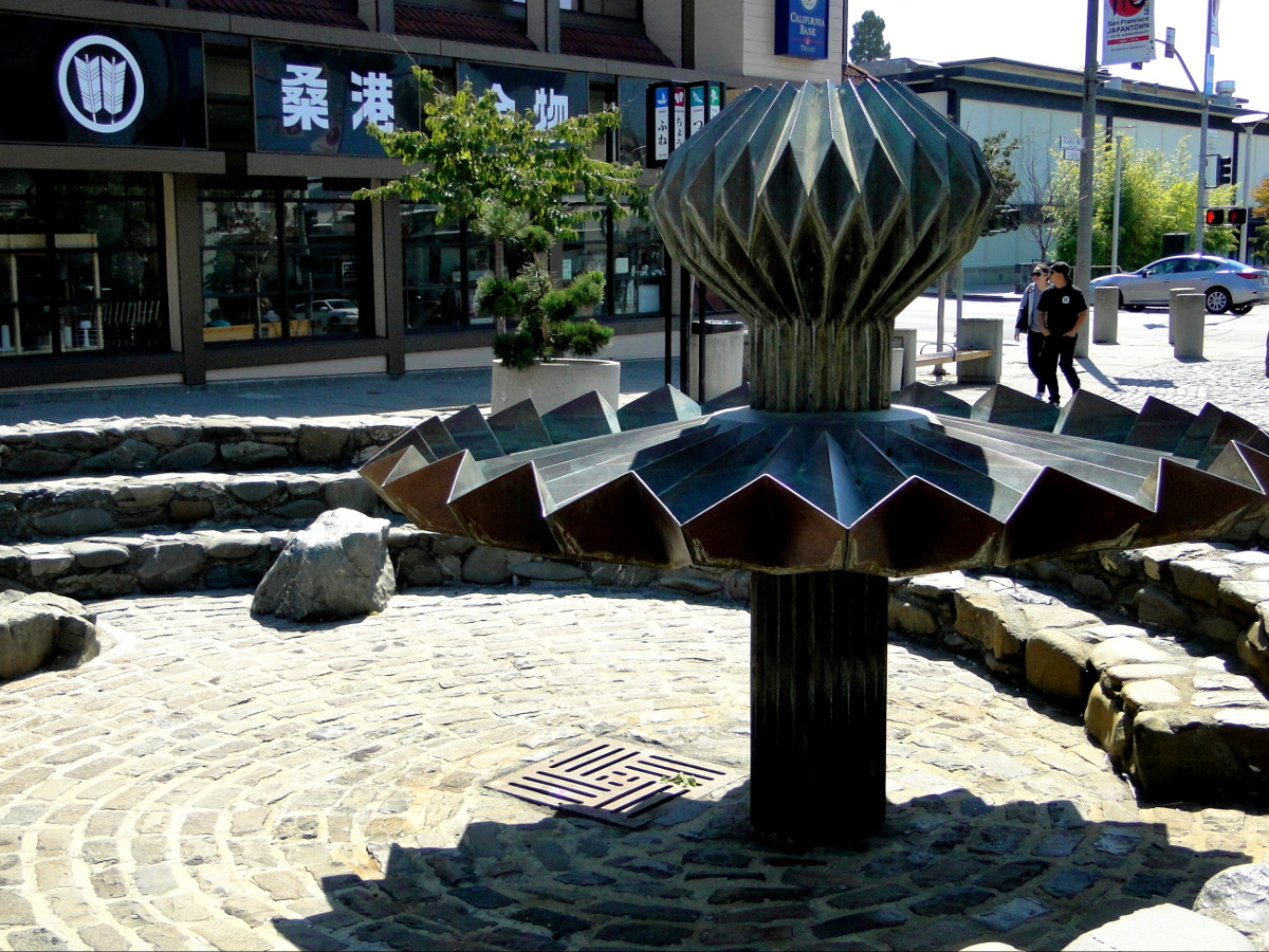 - Brick_Pavement, Concrete_Design, Decorative_Statue, Fountain, Green_Trees, Outdoor, Public_Space, Urban_Environment, Water_Feature