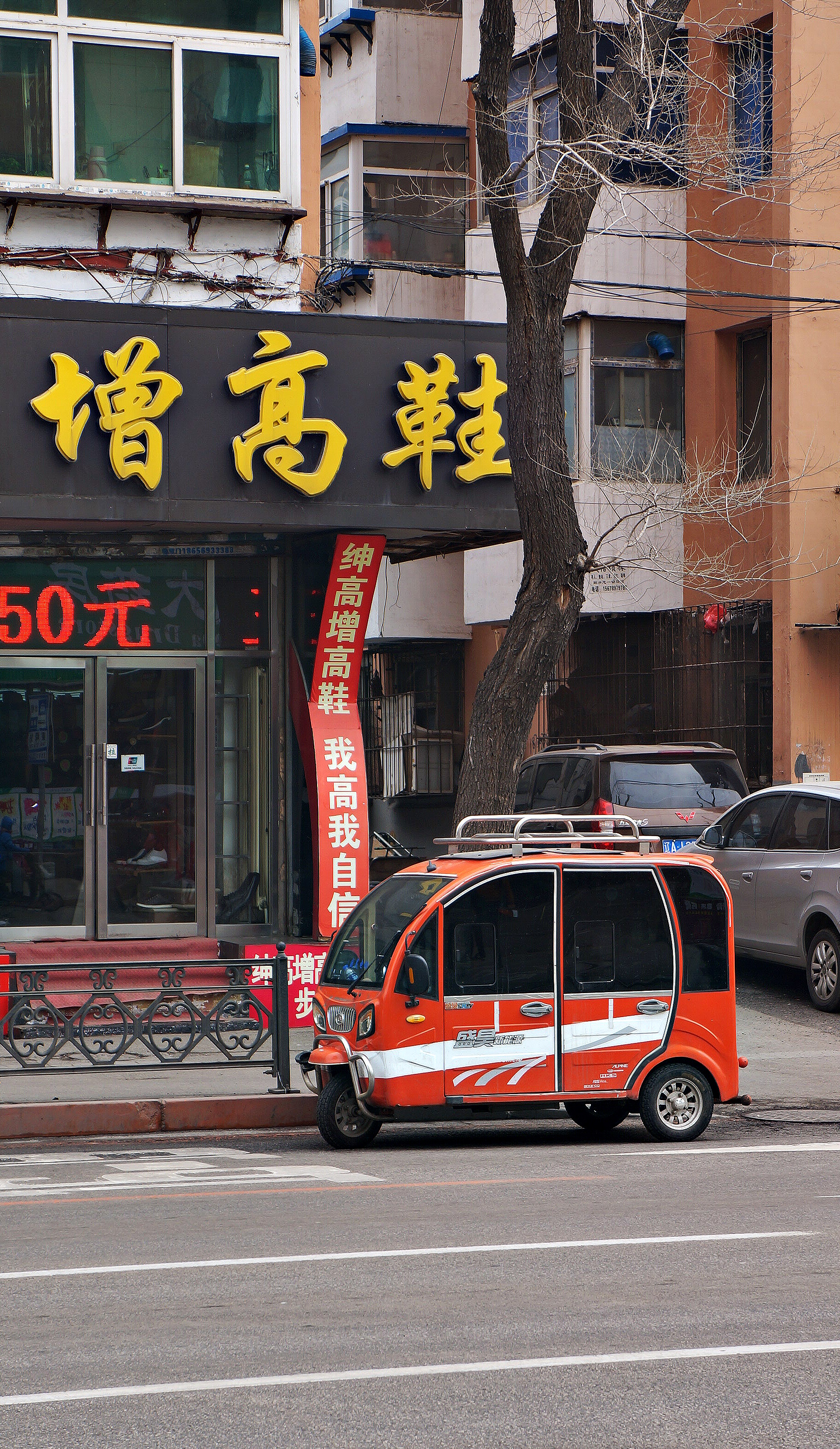 The image depicts a vibrant street scene in Shenyang, China. The central focus is a small storefront with yellow text, which appears to be written in traditional Chinese characters, suggesting it could be a local business or restaurant. In the foreground, there is a red and black bus parked by the curb, indicating public transportation availability. A few cars are also visible on the street, hinting at an urban environment. The presence of multiple languages suggests that this area might be multicultural or tourist-friendly. The overcast sky and lack of people in the image suggest it could be a quieter part of town or captured during a time when there's less activity.
