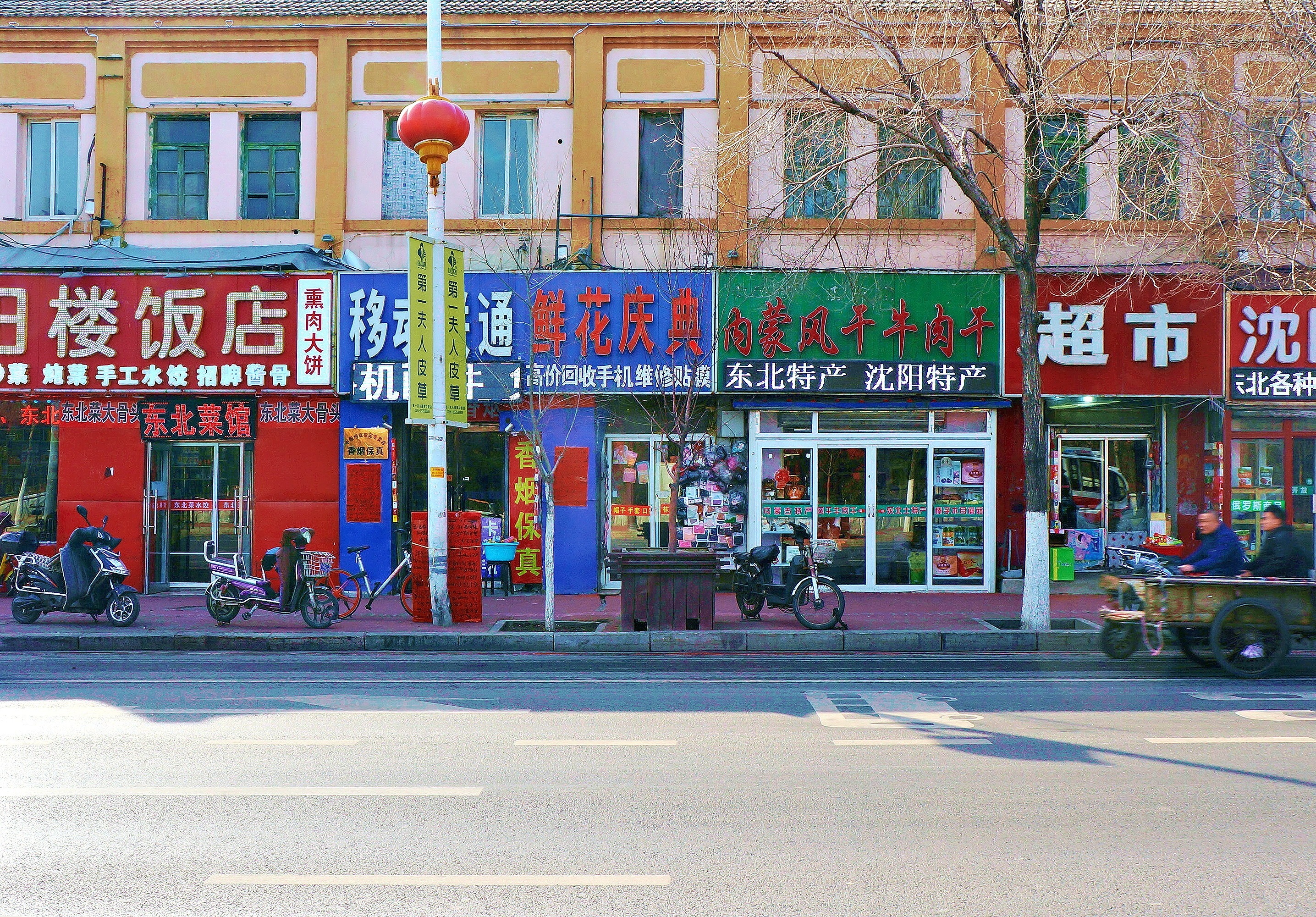 The image captures a lively commercial area in Shenyang, China. The street is bustling with small shops, each displaying an array of wares, attracting customers. On the right side of the street, there's a motorbike parked next to a building that has Chinese characters on its facade. This suggests a vibrant local culture and commerce. A red flag hangs from one of the buildings, possibly indicating a shop or service related to the flag's color. The area appears to be well-maintained and clean, indicative of a thriving urban environment.