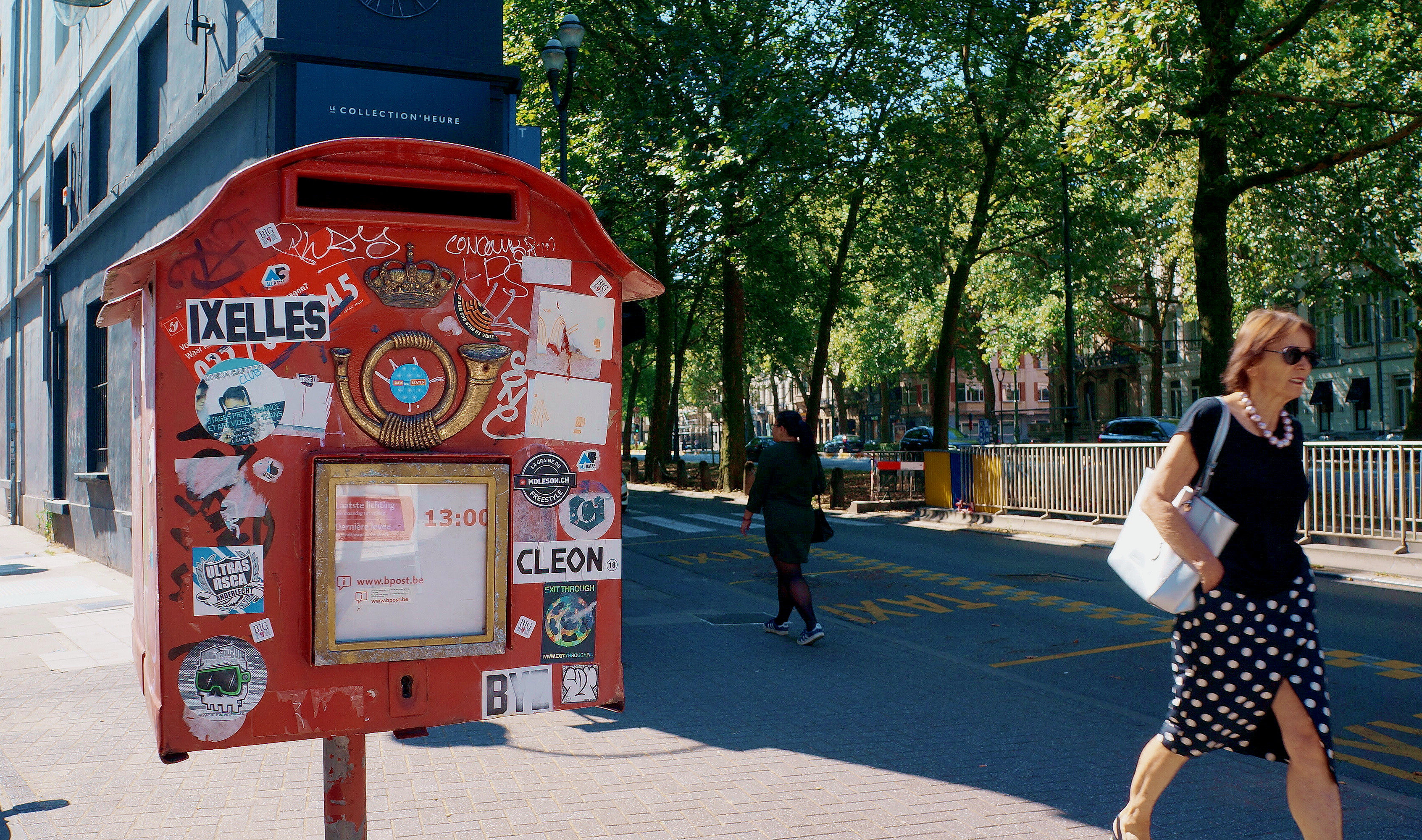 A lively street corner in Brussels, Belgium showcasing a red mailbox and a city bus stop.