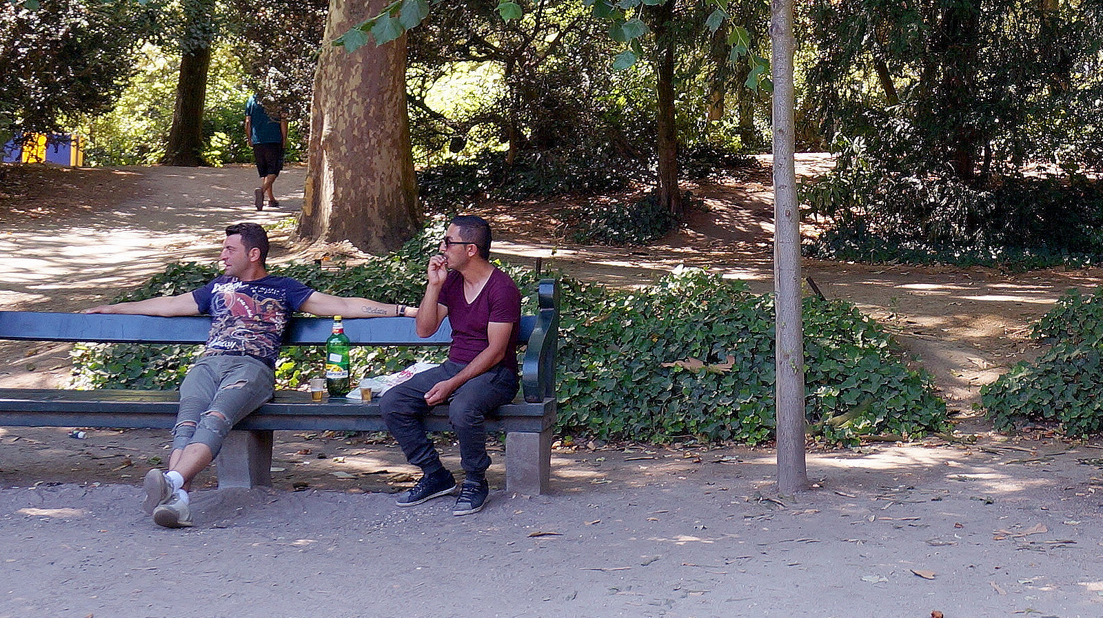 - Bench, Friendship, Leisure, Outdoor_Seating, Public_Space, Recreational_Activity, Relaxing, Summer, Urban_Park
