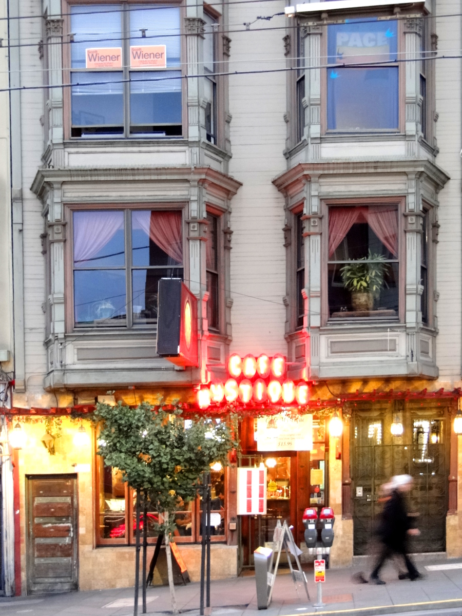 This image captures the lively atmosphere of a nighttime scene in San Francisco, featuring a colorful storefront. The building's architecture is notable, with multiple levels and decorative elements. A bright neon sign stands out against the dark sky, illuminating the entrance of the restaurant or shop. People can be seen walking by on the sidewalk, adding to the urban ambiance of the scene. The image conveys a sense of liveliness and vibrancy typical of San Francisco's nightlife.