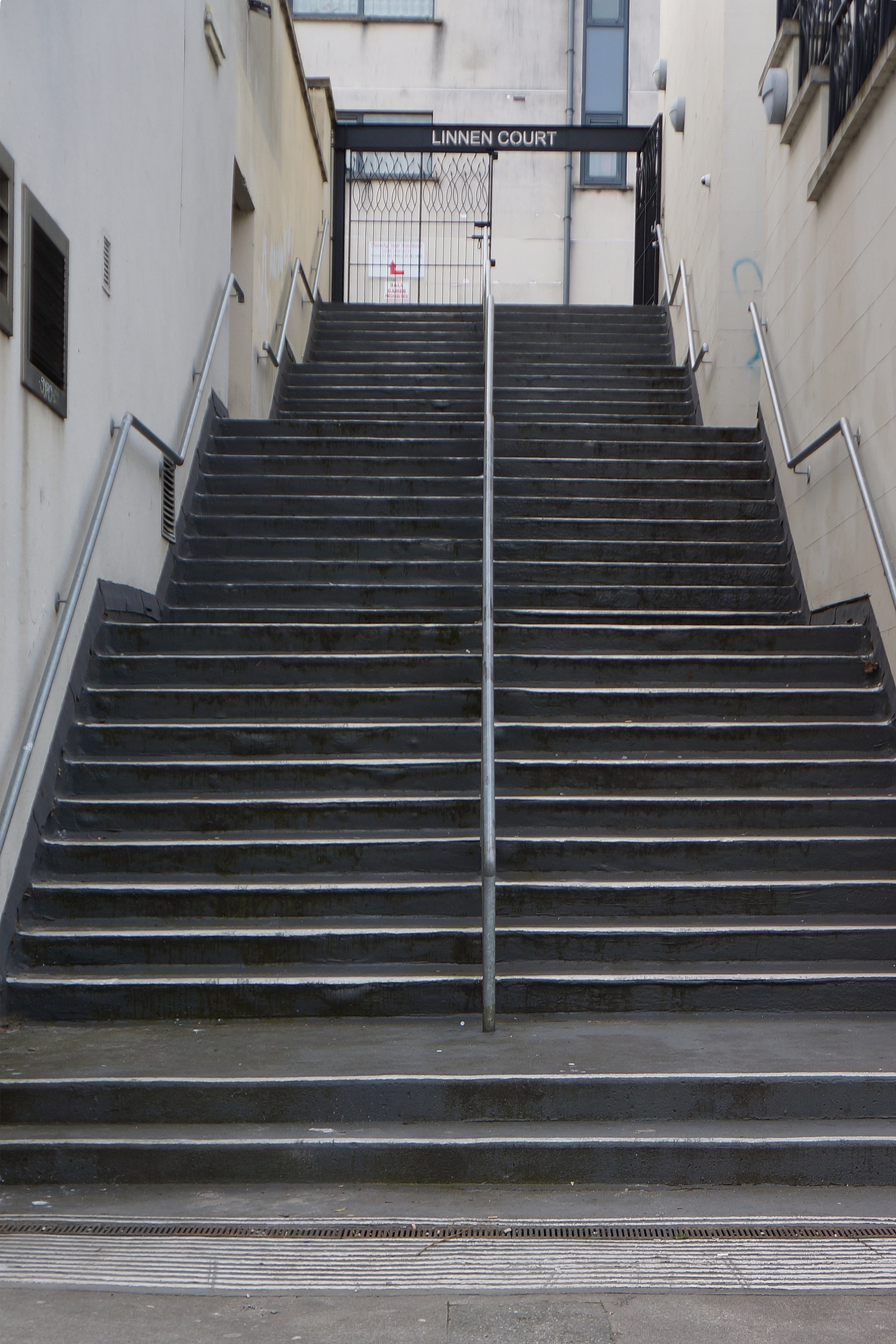 This image captures a set of stairs leading up to an apartment or building entrance. The stairs have a handrail on both sides, providing support and safety for users. This outdoor scene is likely part of an urban area, as indicated by the balcony visible above the stairs. The ramp in the foreground suggests that this location is accessible and accommodates a range of users. The image has a vertical orientation and presents a clear perspective of the staircase, emphasizing its structure and utility within the urban context.