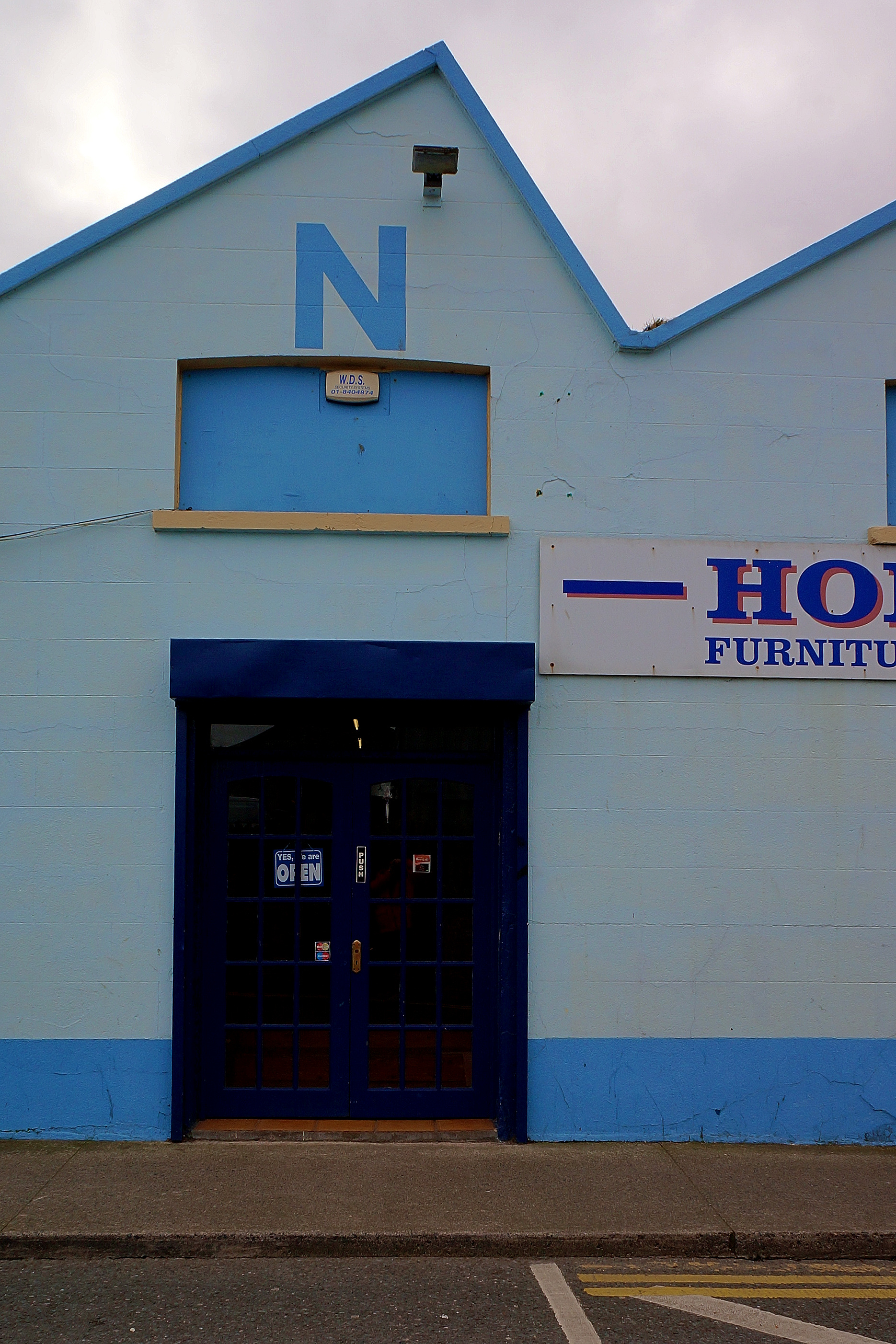 This image showcases a lively furniture store situated on the outskirts of Balbriggan, Ireland. The store's exterior is painted in a striking combination of blue and white, with the name 'NORTH' prominently displayed above the entrance. The shop features a large window that allows passersby to peek into the interior, potentially revealing more about the variety of furniture pieces available inside.