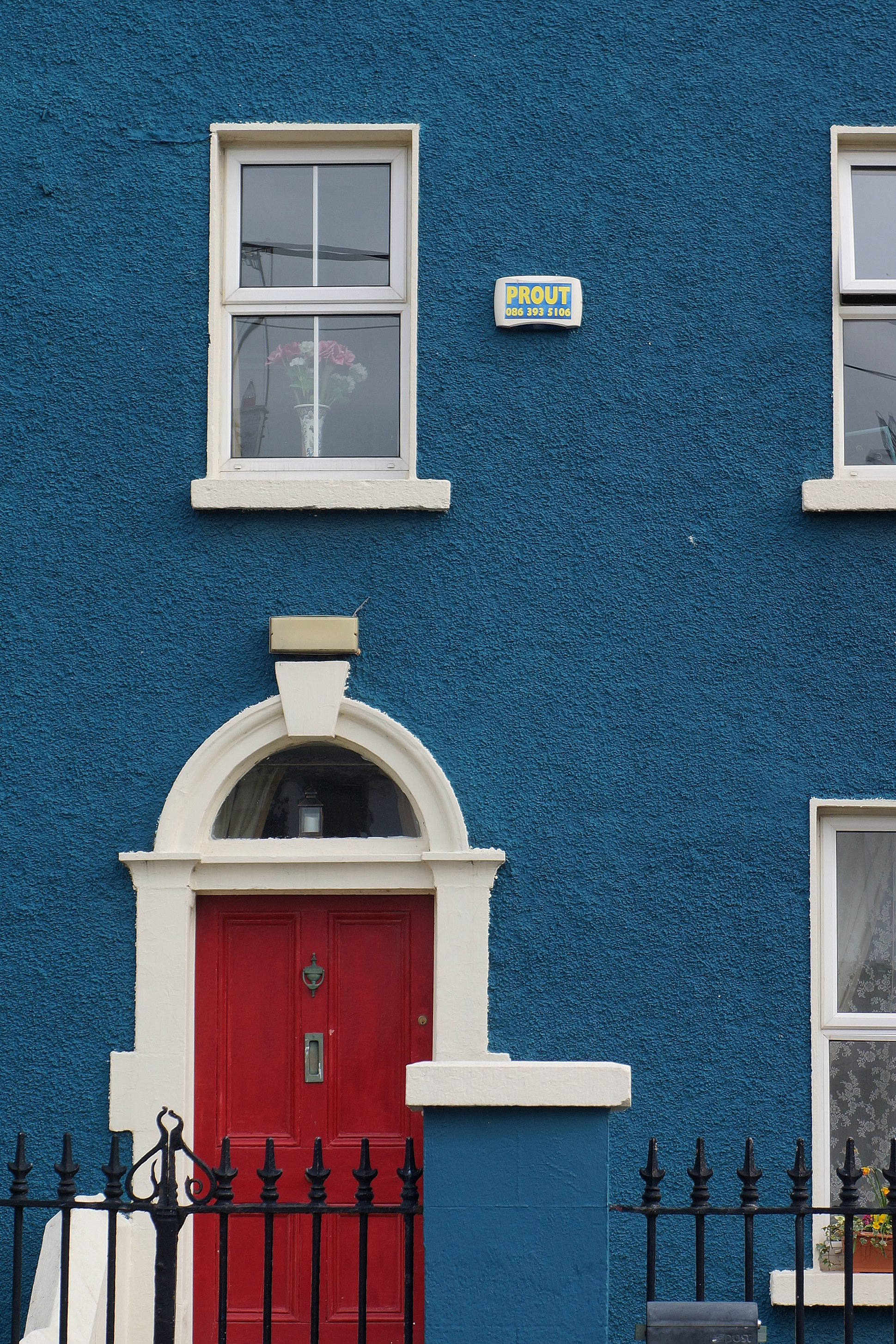 This image captures a quaint scene of a residential building in Balbriggan, Ireland. The house is painted blue and features a striking red front door. On the side of the house, there is a small sign. The house is situated next to a street with other houses visible in the background. The setting suggests a peaceful suburban neighborhood.
