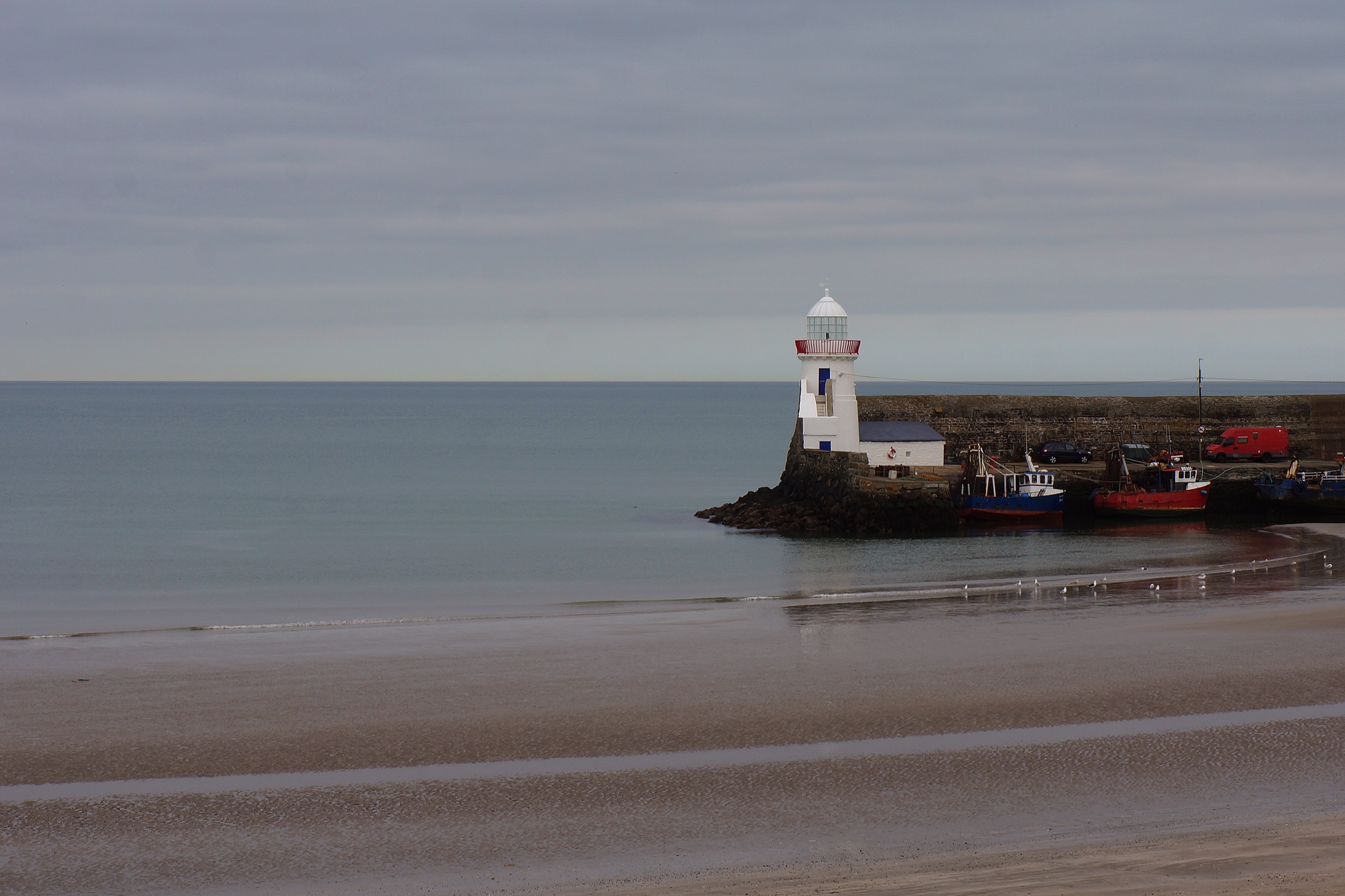 A peaceful scene of a small lighthouse overlooking the calm sea at Balbriggan in Ireland. The lighthouse serves as a charming focal point amidst the serene coastal landscape.