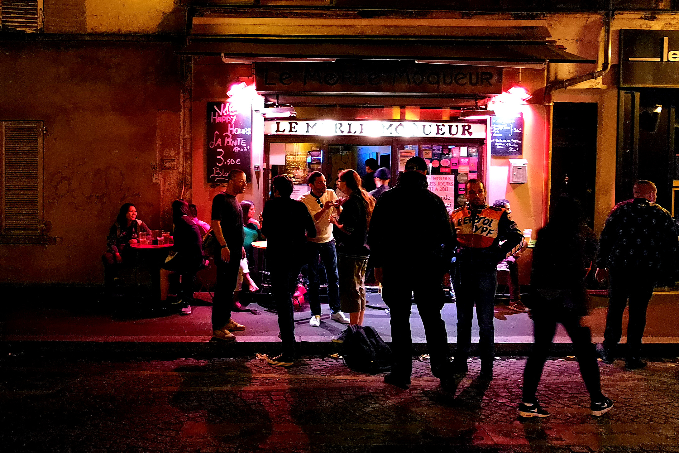 The image captures a lively scene outside a bar or restaurant in what appears to be a European city, likely Paris. A group of people are gathered outside the establishment, engaged in conversation and enjoying their time together. The atmosphere is casual, with some individuals holding drinks, possibly beer bottles. The setting suggests a typical evening out in the city, with a mix of locals and tourists taking advantage of the urban nightlife scene.