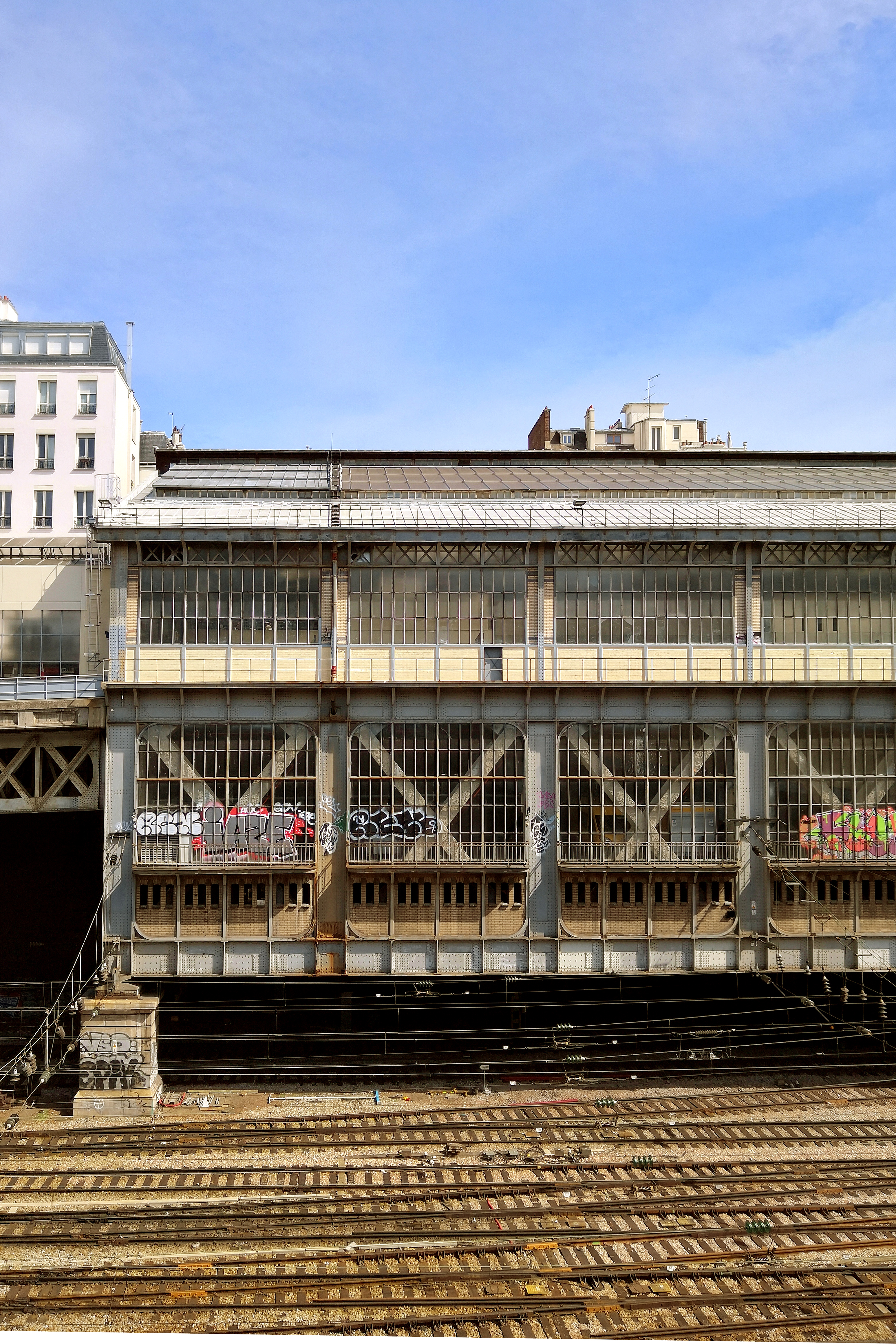 The image showcases an old and abandoned train station located in a European city, specifically France. The station appears to be in disuse, with a corrugated metal roof and a simple, unadorned structure that speaks of its once-functional purpose. A large glass window allows natural light to filter through, contrasting with the surrounding environment. The platform is empty, devoid of passengers or activity. The station is situated near railway tracks, indicative of its past use, and in the background, urban architecture suggests a bustling cityscape that has perhaps left this historic structure behind.