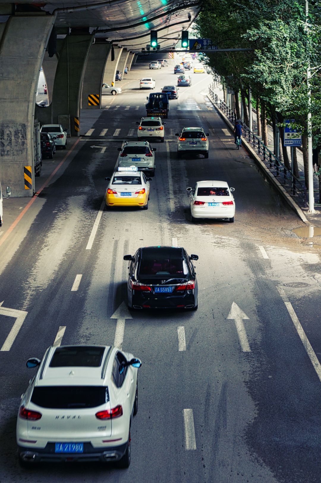 An overhead image capturing the bustling traffic of a major road in Shenyang, China. The scene showcases a variety of vehicles including cars and buses navigating through the city's underground tunnel. This perspective provides a unique view of the city's transportation infrastructure during peak hours.