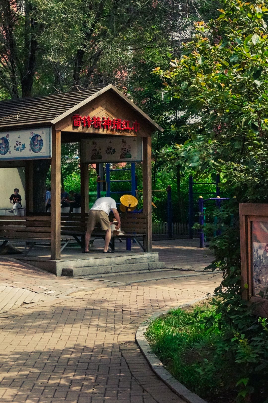 This image depicts a pavilion in a public park, situated within a children's playground area. The pavilion appears to be equipped with amenities for visitors and has a bench nearby for rest. It is located in Shenyang, China.