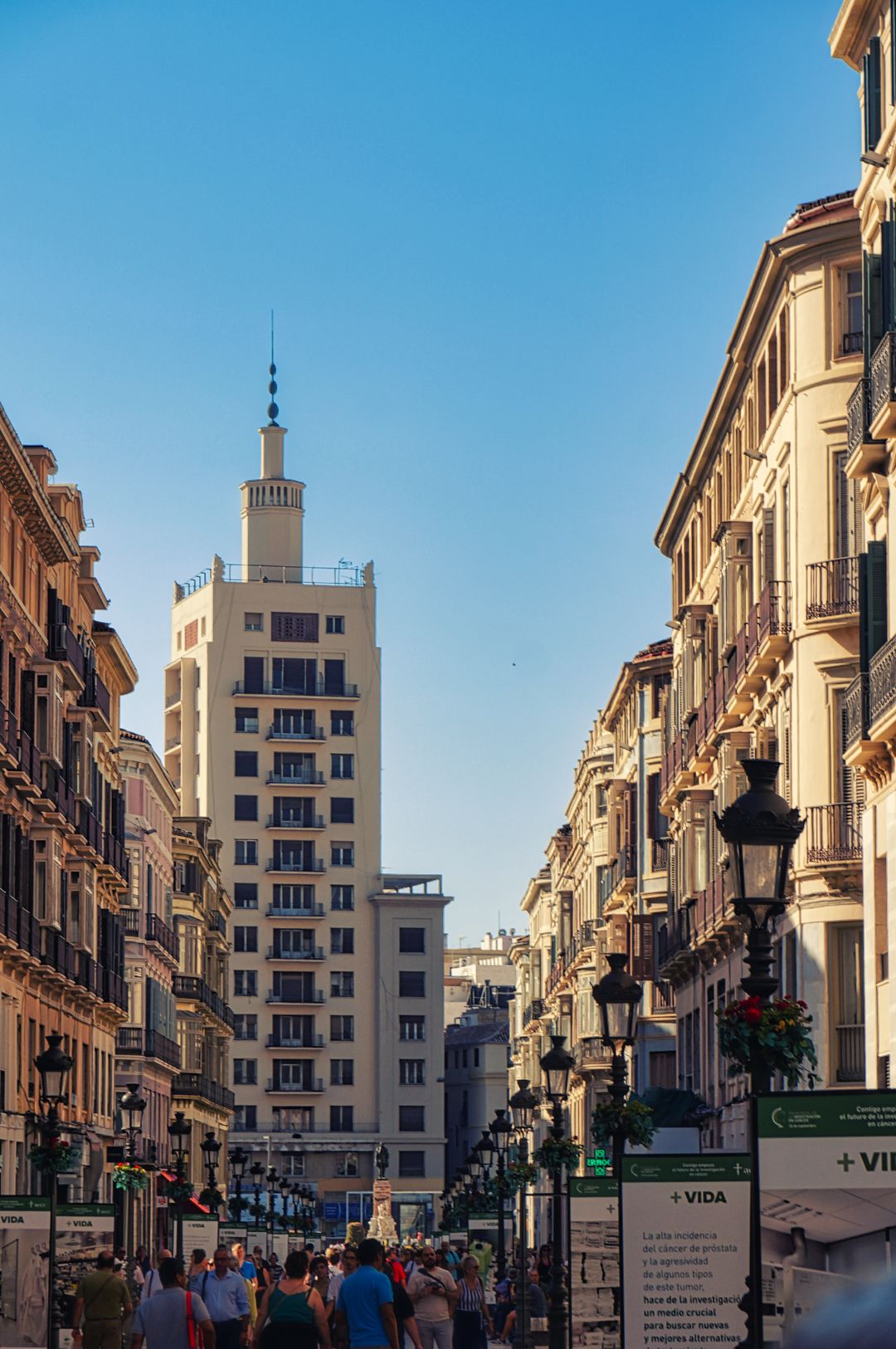 The image captures a vibrant city street in Malaga, Spain. The scene is framed by historic buildings on either side, with balconies and terraces adorned with potted plants. A clear blue sky graces the backdrop, hinting at pleasant weather conditions. Street art and signage add to the urban character of the image. Pedestrians can be spotted on the sidewalks, going about their day, contributing to the lively atmosphere. The perspective from a slightly elevated angle provides a sense of depth and scale to the scene, showcasing both the architectural details and the bustling street life.