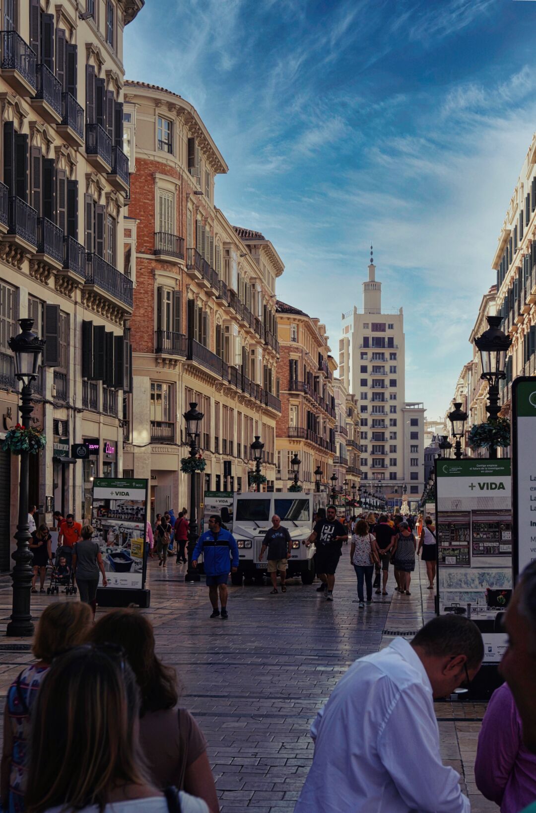 This image captures the lively atmosphere of a street in Malaga, Spain. The perspective is from above, offering a panoramic view of the bustling scene below. The street is lined with buildings that have a distinctly European architectural style, suggesting a setting rich in history and culture.