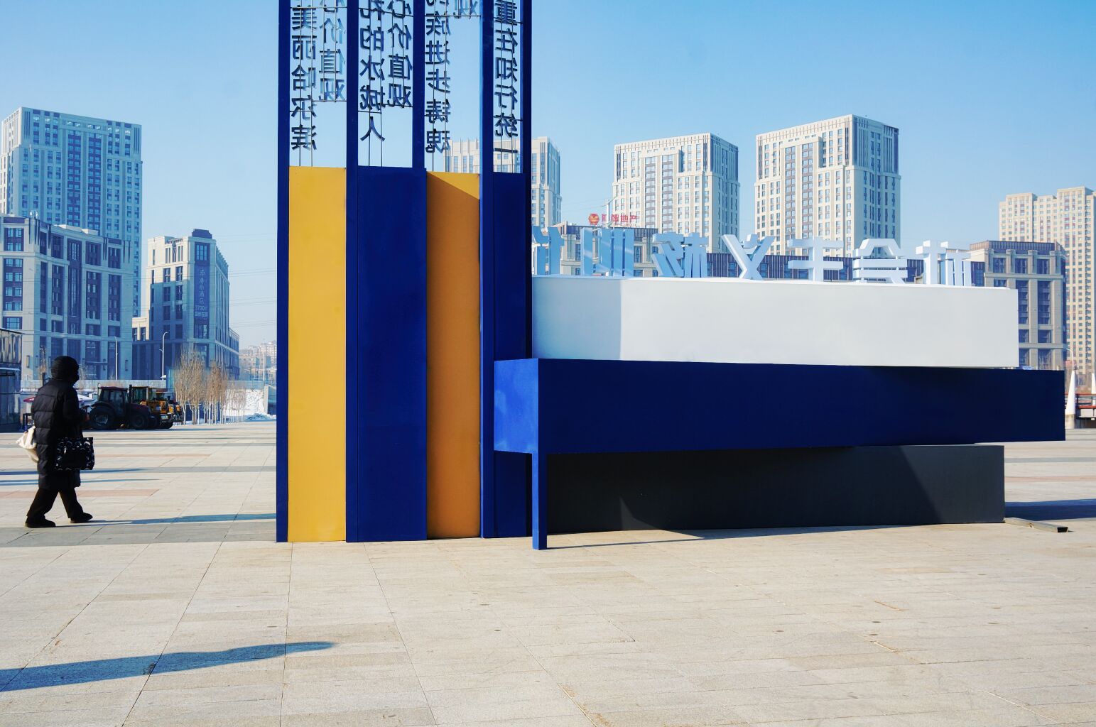 A dynamic cityscape featuring an artwork that combines geometric shapes with a modern, minimalist aesthetic. The artwork is situated within a public space, possibly a park or plaza, and stands out against the backdrop of urban architecture. The blue, yellow, and white color palette adds to the visual appeal of the installation.