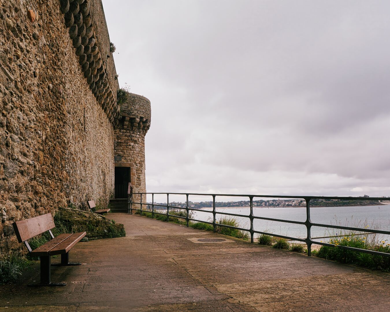 - Bench, Castle, Coastal_View, Nature, Ocean, Park_Bench, Rainy_Weather, Stone_Wall, Walkway